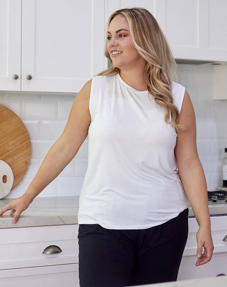 Our new Taylor Tank is a wardrobe essential! An on-trend sleeveless cut with long curved back hem. The light-weight soft fabrication is easy to tuck-in or perfect for layering under knits and jumpers. Style with our Freez Slouch or Lounge Pants.