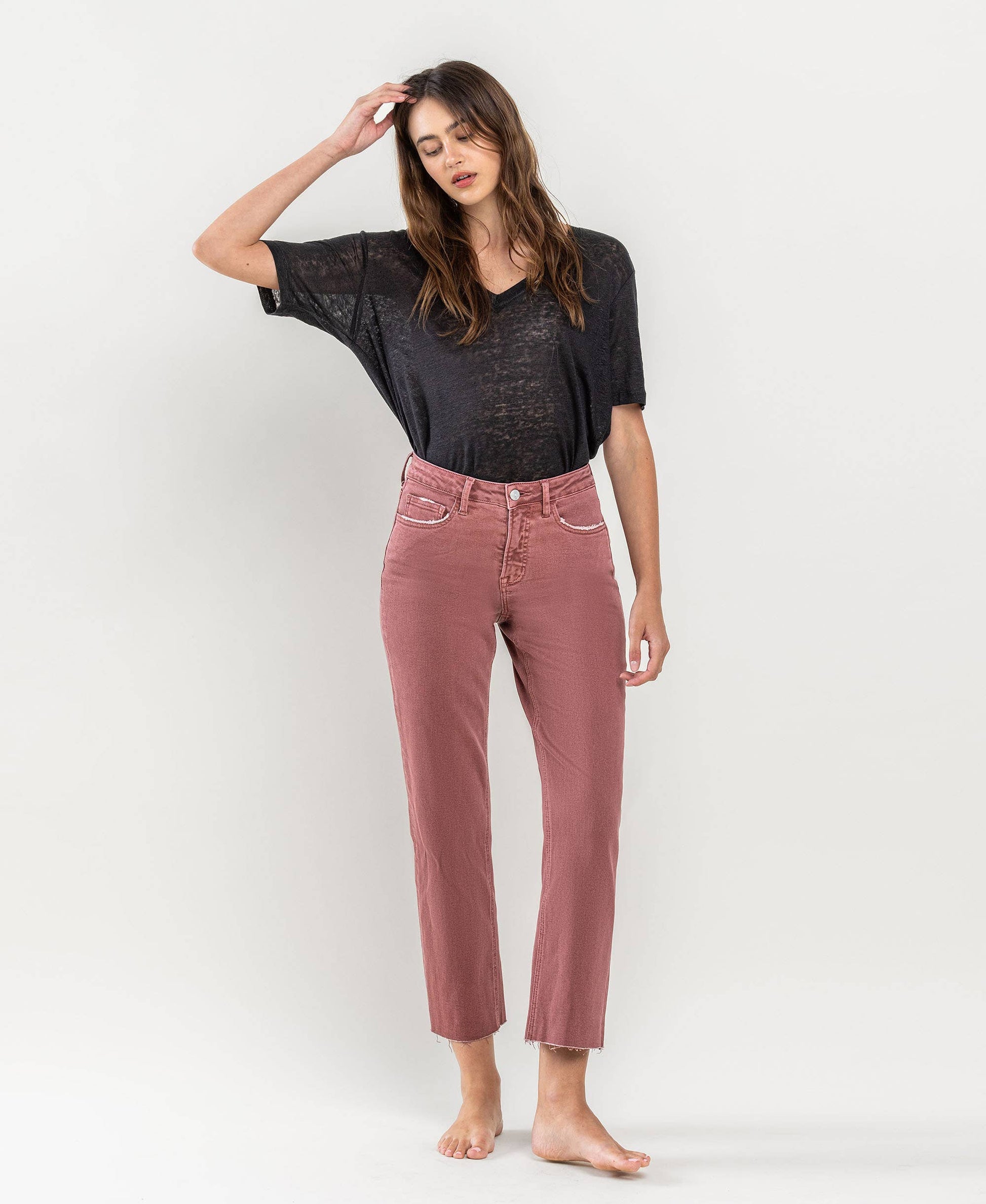 COMFORT STRETCH DENIM, HIGH RISE WAIST, CLEAN CUT RAW HEM, CROPPED LENGTH, STRAIGHT JEANS